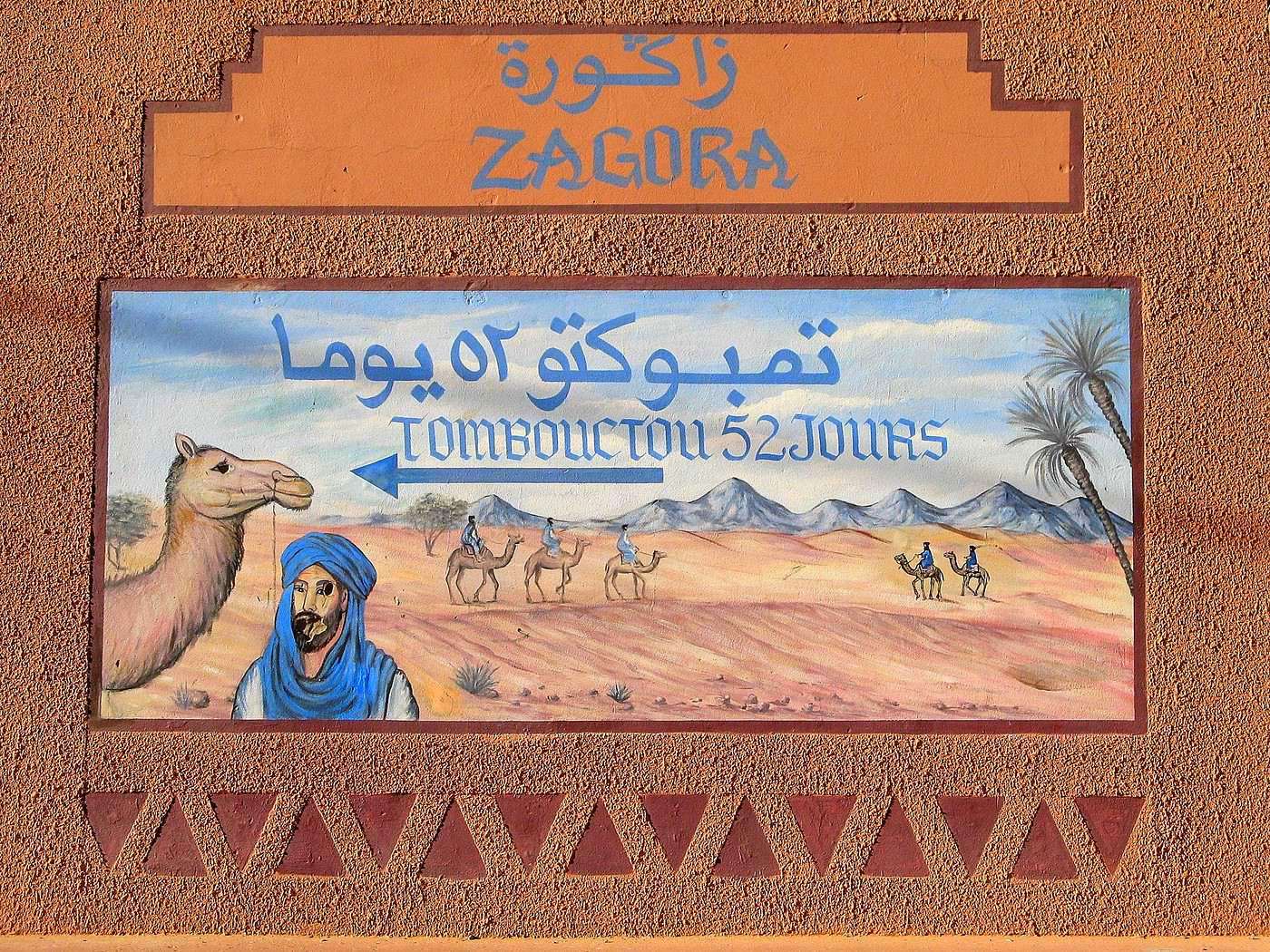 Prima di far ritorno a Ouarzazate, raggiungiamo Zagora, cittadina fondata dai francesi nel periodo del Protettorato. La prima foto che scatto è quella al murales con scritto “Timbuctu, 52 giorni a dorso di cammello” un’iscrizione che rievoca il periodo d’oro delle grandi carovane che attraversavano il Sahara. Il nostro pullman si addentra quindi nella Valle del Draa che, come dimostrato dalle incisioni rupestri scoperte nei pressi di Tinzouline, era abitata da guerrieri di epoca preistorica. La valle, le cui costruzioni sono in buono stato di conservazione, contiene un gran numero di ksour e kasbah, tra cui quella di Igdaoun che domina il paesaggio con le sue piramidi tronche.