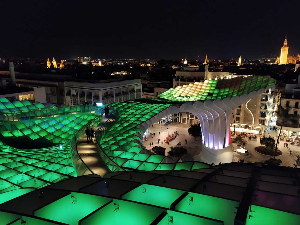 Un’architettura futuristica, molto suggestiva di notte per via delle luci colorate e cangianti che illuminano le passerelle pedonali di questa magnifica terrazza panoramica affacciata sulla città. All’epoca del mio primo viaggio, La Seta non esisteva nemmeno nelle fantasie del suo costruttore, l’architetto tedesco Jurgen Mayer-Hermann e difatti l’unico panorama dall’alto, ammirato in occasione del mio primo incontro con Siviglia, è stato quello dalla cima della Giralda, uno dei più raffinati minareti arabi, mirabile esempio di decorazioni moresche. Eretta nel XII secolo e trasformata nel 1588 in campanile con l’aggiunta di una guglia e di una statua della Fede che gira su se stessa (da qui il nome Giralda), la torre non è neanche troppo faticosa da ascendere. Non ci sono infatti scalini, ma facili tornanti, comode rampe concepite in origine affinché il muezzin, l’addetto alla moschea che cinque volte al giorno richiama i fedeli alla preghiera, potesse salirci a cavallo senza fatica. Nel 1999 avevo ammirato lo scenografico cortile di Casa de Pilatos, lo splendido palazzo quattrocentesco noto per la mirabile fusione di elementi di architettura moresca, gotica e di arte rinascimentale italiana.