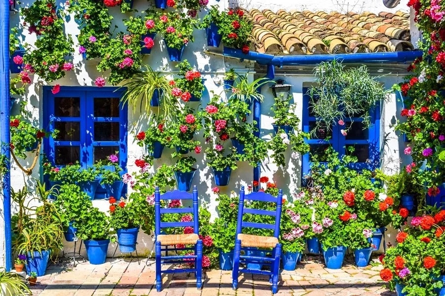 E sono altrettanto affascinanti, sia pur in modo completamente diverso le case di Cordoba, la città fondata dai Fenici sulla riva destra del fiume Guadalquivir (in lingua araba Fiume Grande). Le sue acque calme sono attraversate dal Ponte Romano a 16 arcate che, sia pur totalmente rifatto dai mori e restaurato in varie epoche, rimane l’immagine più caratteristica di Cordoba, soprattutto nella calda luce del tramonto, insieme a quella della celeberrima Cattedrale o Mezquita, splendido esempio di arte araba, con le sue fantasiose prospettive create dagli ordini di archi e dalle colonne in marmi di diverso colore che delimitano le navate disposte a scacchiera. Ma sono le case di Cordoba, anzi per meglio dire i suoi cortili ad accendere la mia fantasia. Le visitiamo in aprile, ma solo un mese più tardi questi patii si sarebbero animati grazie ad un evento riconosciuto dall’Unesco come Patrimonio Immateriale dell’Umanità, un concorso a premi che richiama migliaia di visitatori. Per circa due settimane los Patios de Córdoba, i cortili interni di origine islamica, vengono adornati da centinaia di vasi di terracotta contenenti piante aromatiche e fiori dai mille colori e profumi disposti scenograficamente sul pavimento o appesi alle pareti imbiancate a calce.