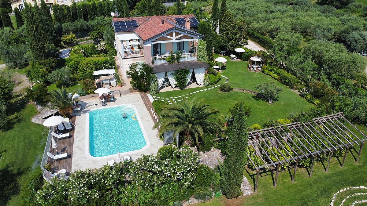 Le cinque camere in stile rustico-elegante gardesano, ognuna con terrazza privata, si aprono su ampi spazi verdi e piscina con il lago di Garda sullo sfondo. Gli ospiti possono degustare e acquistare direttamente i prodotti Esveal, portando a casa il vero sapore biologico del Garda.